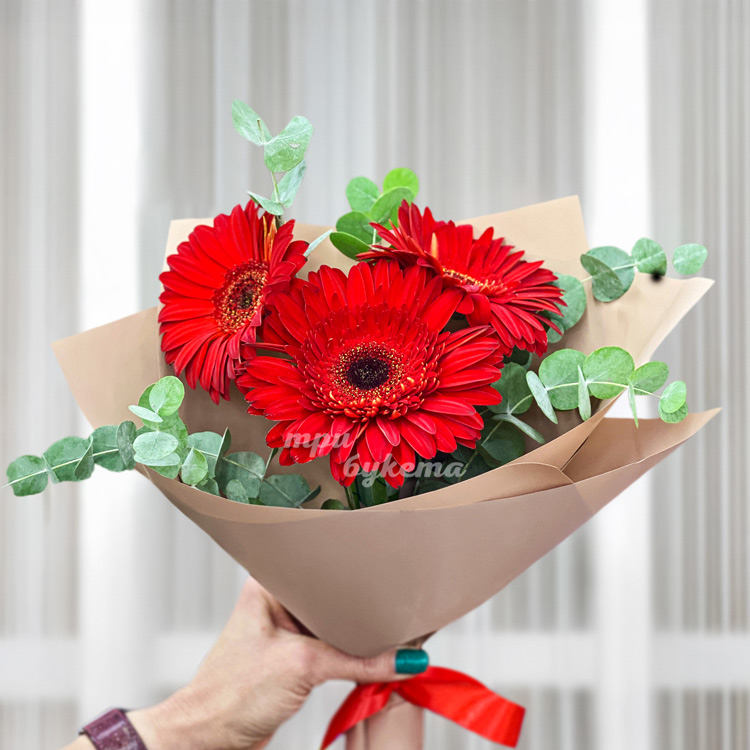Букет из 3 красных гербер с эвкалиптом