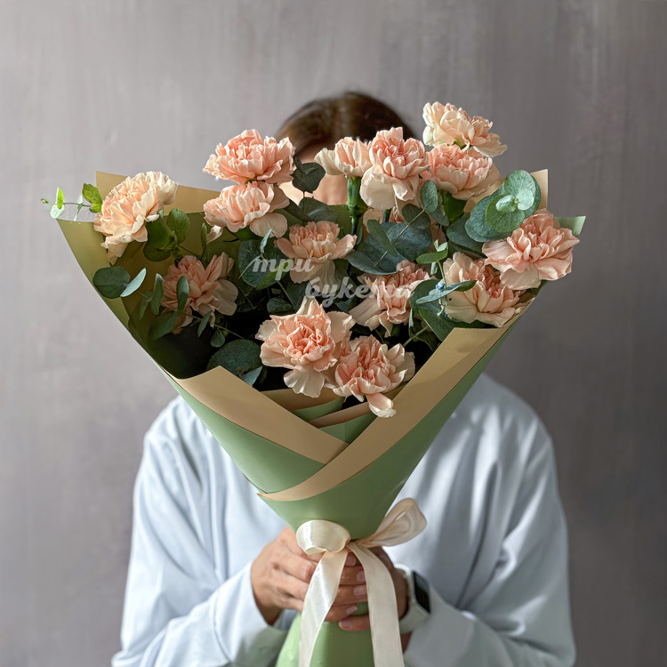 Букет из персиковых гвоздик и эвкалипта