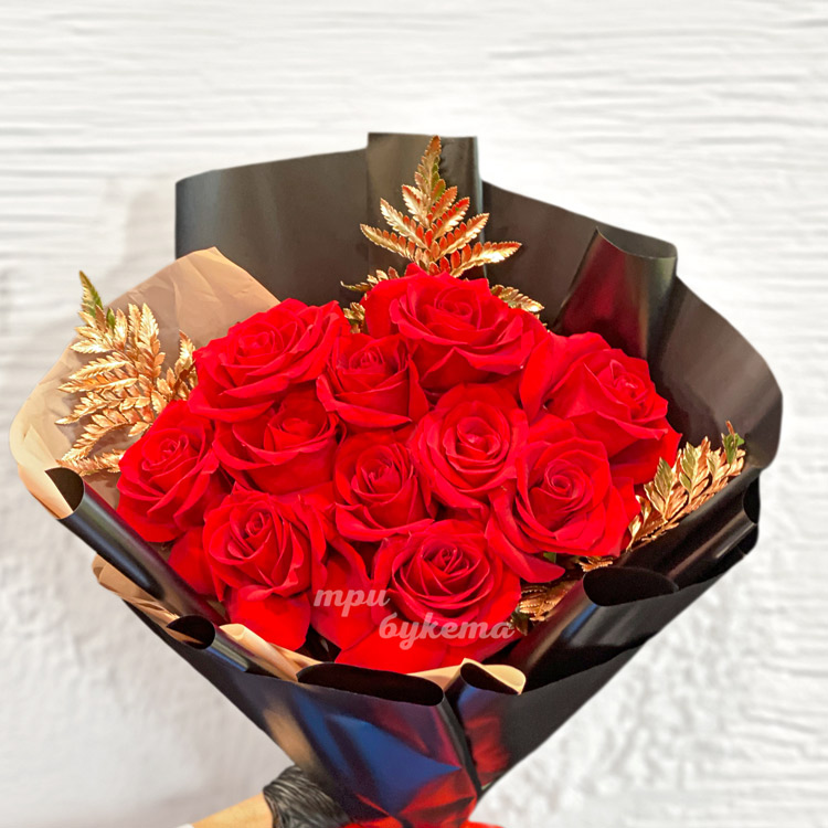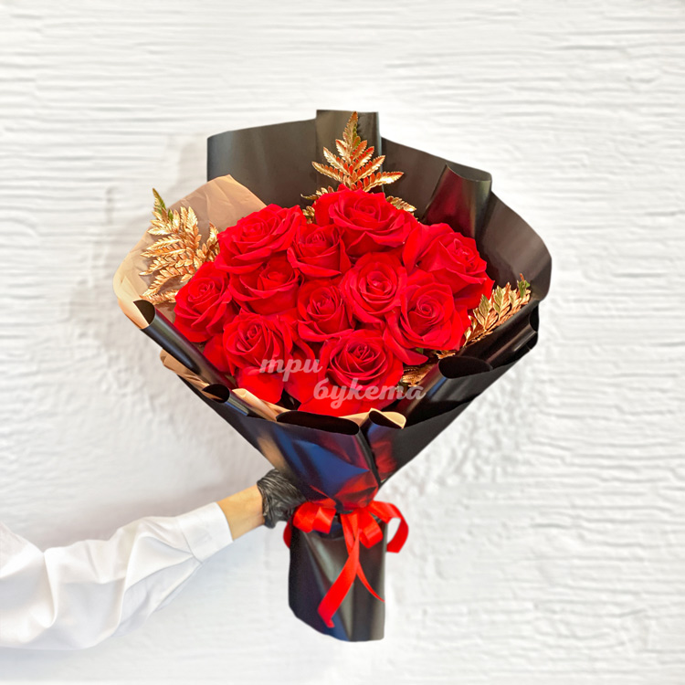 Букет красных роз с золотым папоротником