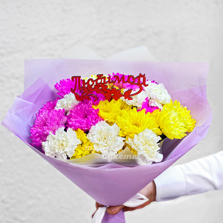 Букет ярких хризантем с белыми гвоздиками