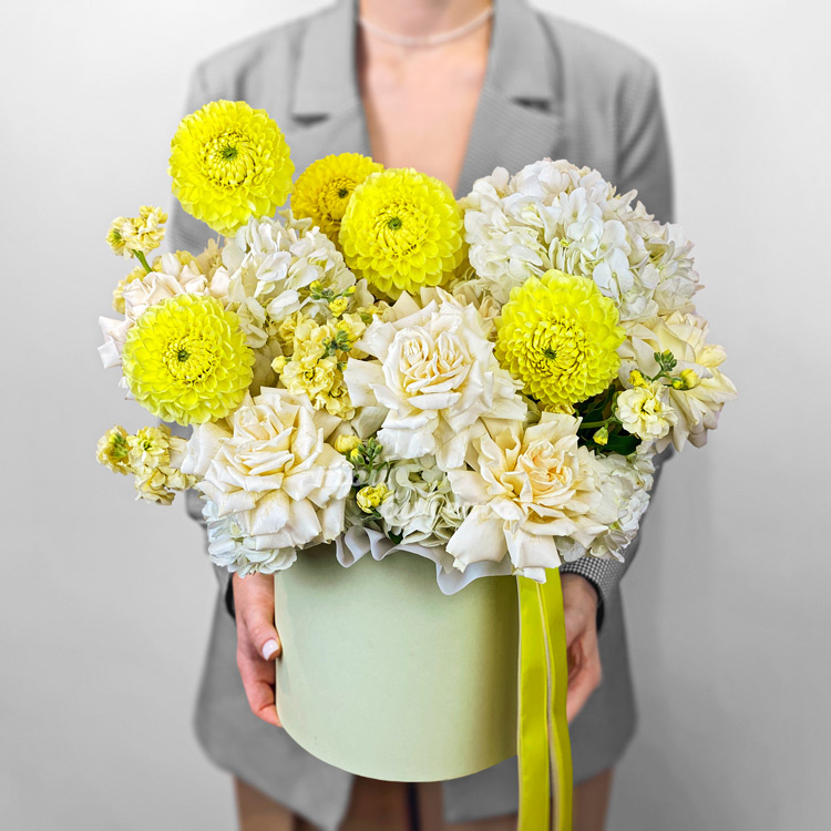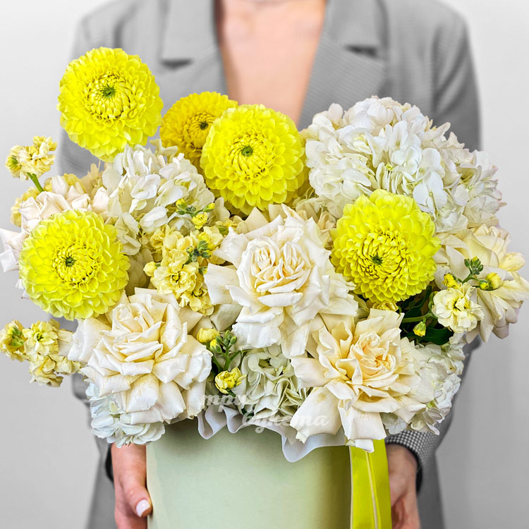 Коробка желтых хризантем, роз и маттиол