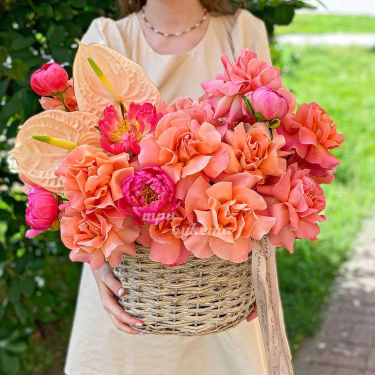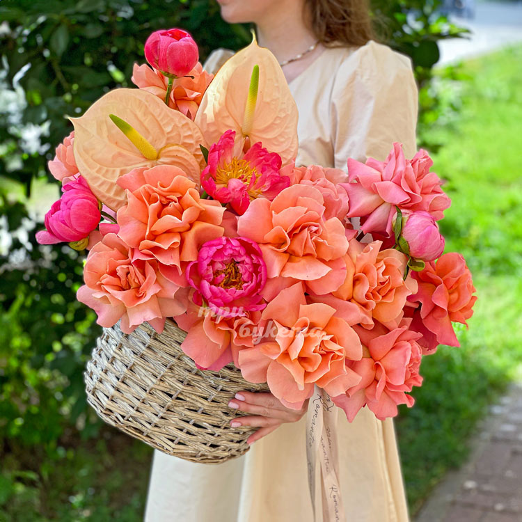 Корзина коралловых роз и розовых пионов