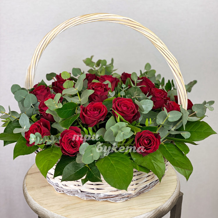 Корзина красных роз с эвкалиптом