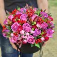 Кустовые розы и макаруны в корзине