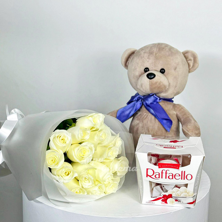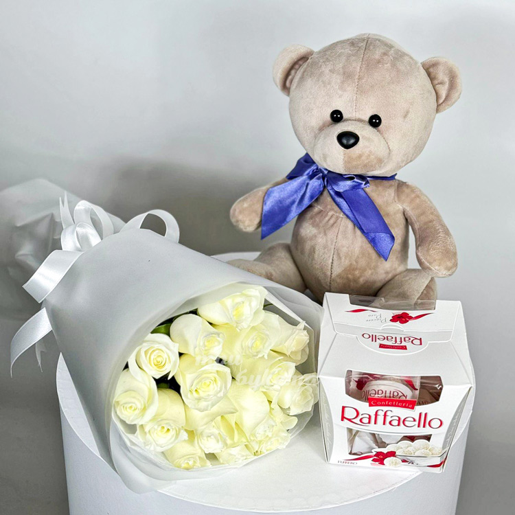 Набор из мягкой игрушки, конфет и 15 белых роз