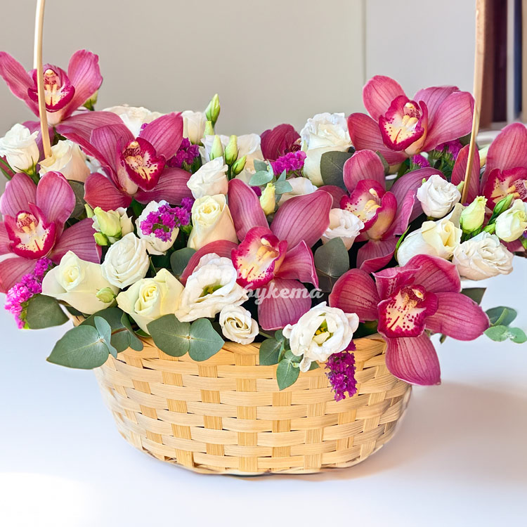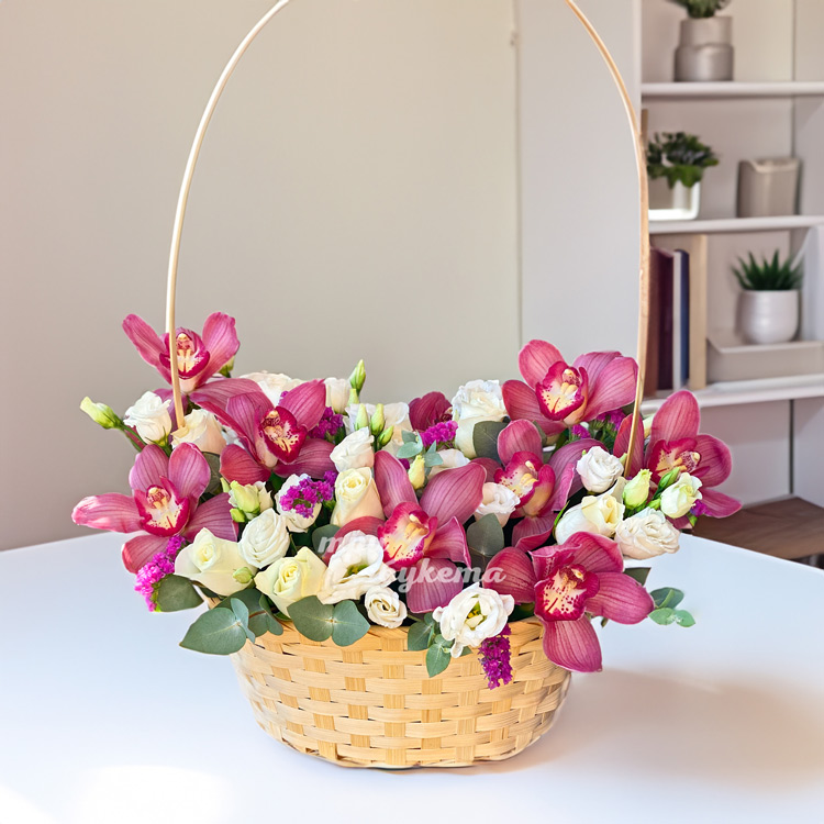 Орхидеи с розами и эустомами в корзине