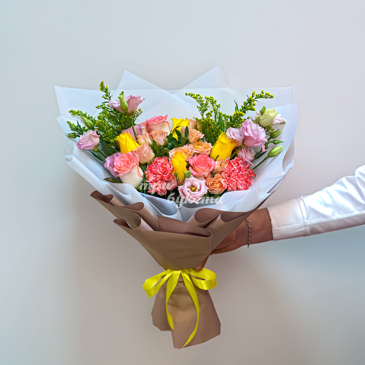 Яркие эустомы, гвоздики и розы в букете
