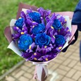 Яркий букет из ирисов, калл и роз