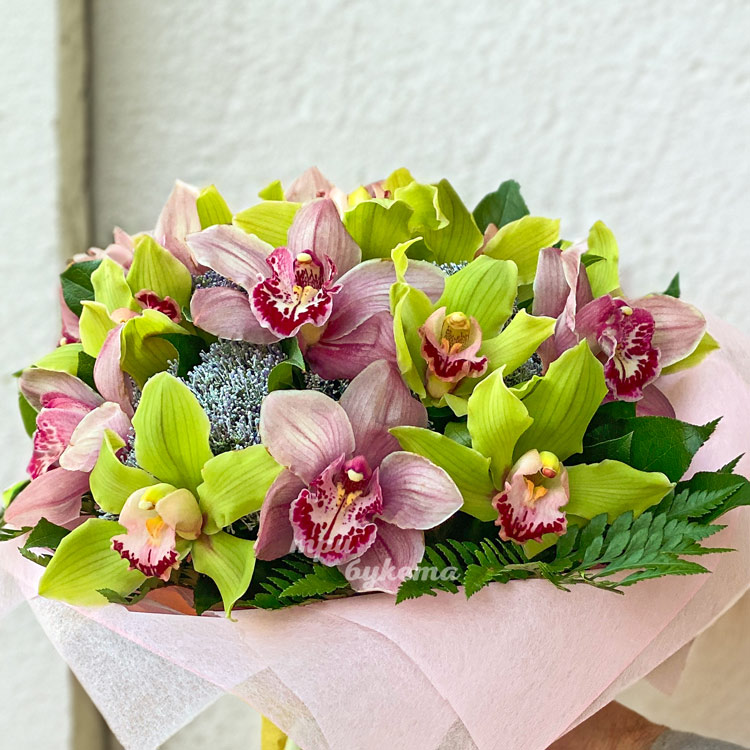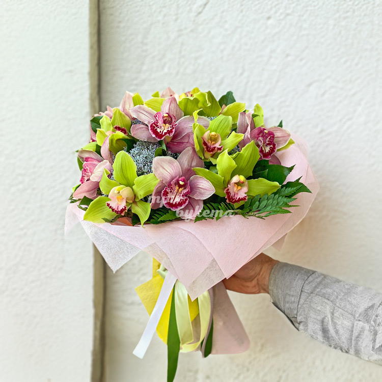 Яркий букет зеленых и розовых орхидей