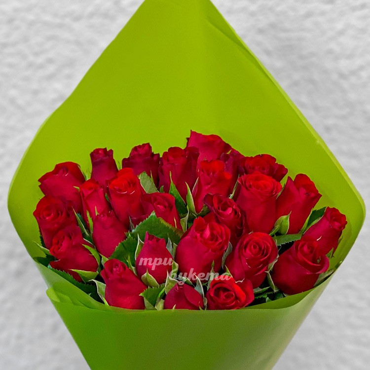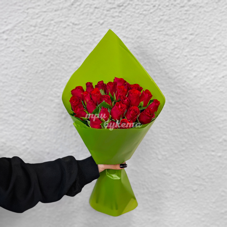Зеленый букет из 25 красных роз